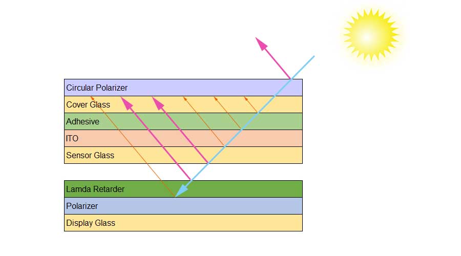 这种解决方案的缺点是其成本。因为我们不仅需要一个圆偏振片,而且还需要在LCD显示屏的顶部有一个延缓膜,以确保来自LCD内部的光线不被外部圆偏振片所阻挡。