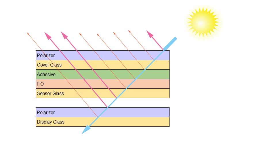 最有效的方法是通过使用光学粘合来完全消除气隙。简单地说,我们用特殊的光学胶粘剂填充气隙,使该区域的折射率差异变得平滑。这样,由内部气隙引起的反射率从8.5%下降到0.5%。 光学胶合剂是一种昂贵但有效的方法来提高TFT LCD的阳光下可读性。它增强了耐久性和抗冲击性。此外,没有气隙意味着没有水分凝结和雾化。